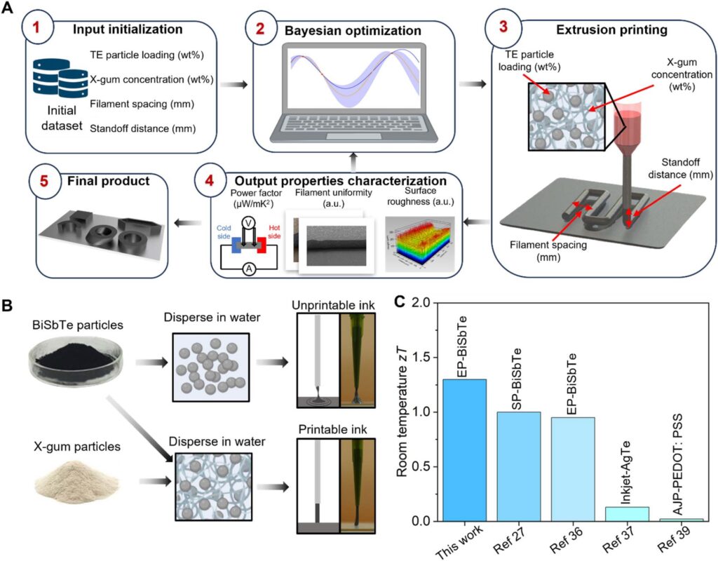 TL;DR: A machine learning-assisted extrusion 3D printing strategy was developed to optimize ink formulations and process parameters, enabling the fabrication of complex-shaped BiSbTe-based thermoelectric materials; thermoelectric performance was further enhanced and electrical conductivity increased through HIP treatment by reducing porosity.