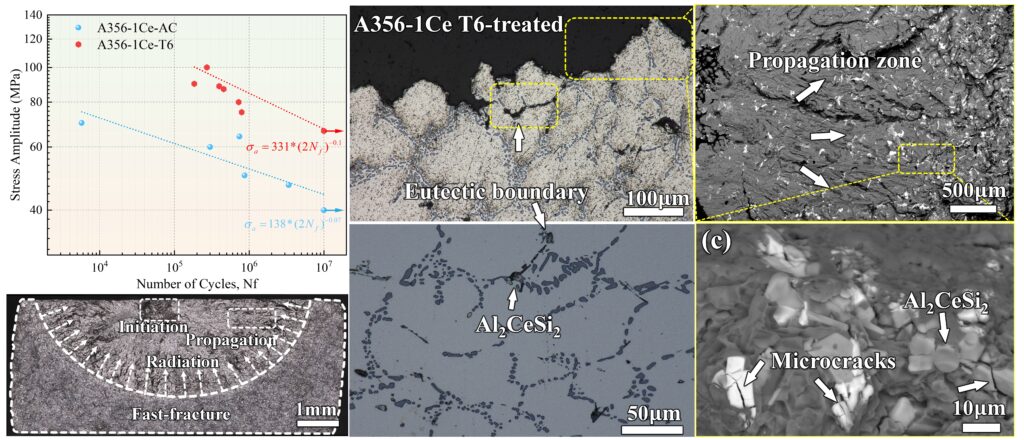 TL;DR: Modified with Ce and T6 heat treatment synergistically enhance the strength and fatigue resistance of A356 alloy through Al₁₁Ce₃ intermetallic formation and eutectic Si refinement, highlighting a tunable strength-ductility-fatigue balance in Ce-modified Al-Si cast alloys.