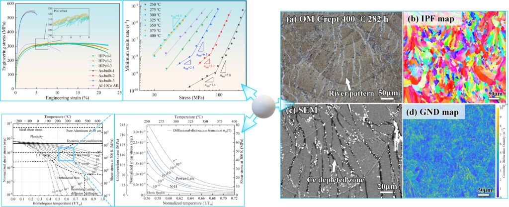 TL;DR: LPBF-processed hypereutectic Al16Ce1Mg alloy demonstrated exceptional printability, tensile strength, and creep resistance enabled by solid solution strengthening, dislocation hardening. Dynamic strain aging-induced PLC effects and Ce-depleted zone evolution governed its strain rate sensitivity and high-temperature deformation.