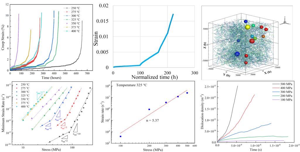 TL;DR: Three-dimensional discrete dislocation dynamics (DDD) simulations using ParaDiS reveal the evolution of dislocation evolution under creep conditions, providing mechanistic insights into steady-state creep behavior and informing lifetime prediction models.
